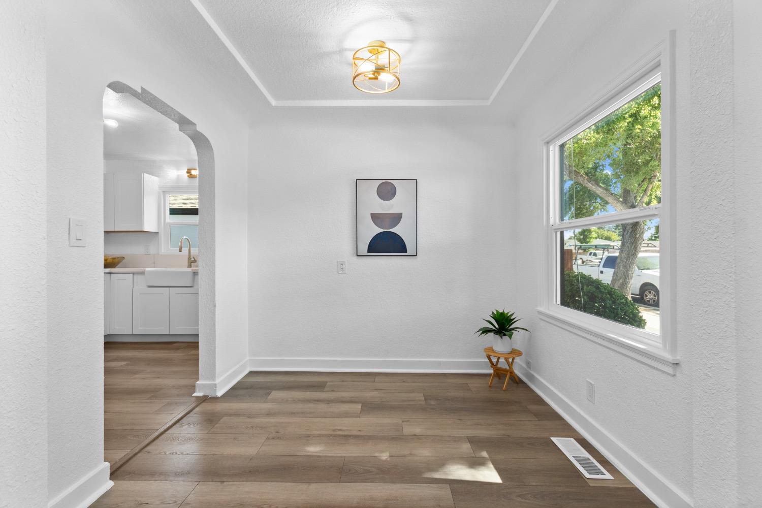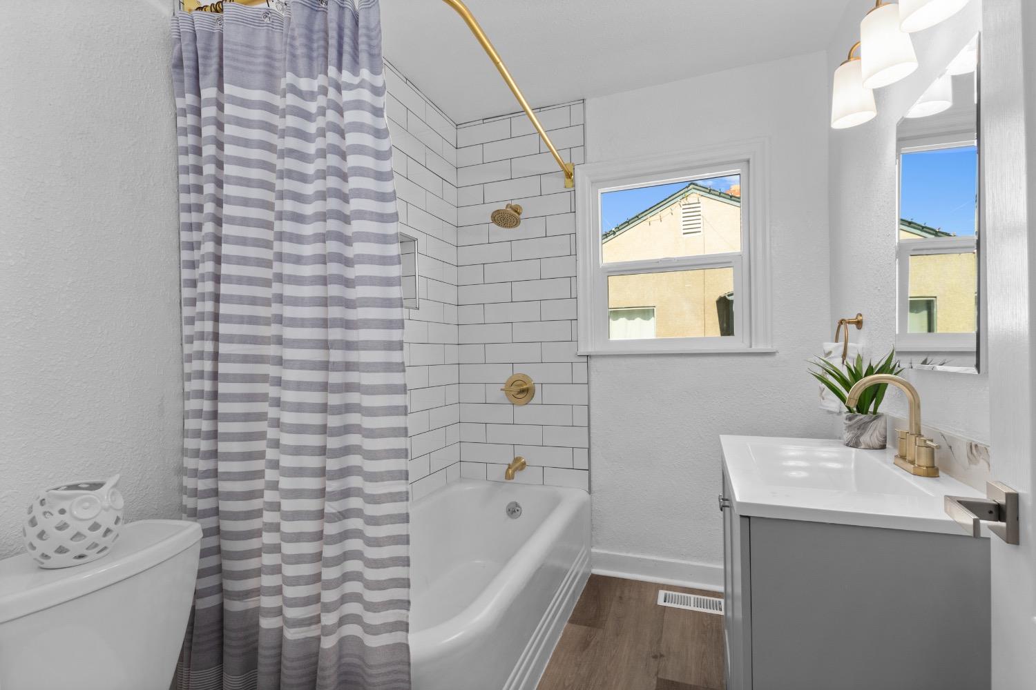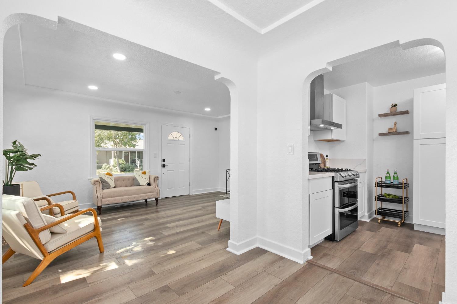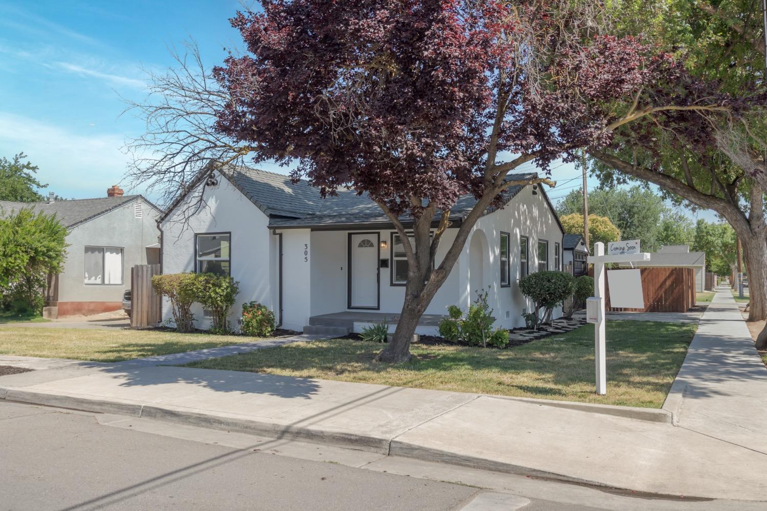 Step into a timeless blend of classic charm and comfort in this captivating 2-bedroom, 1-bathroom home nestled in the heart of Tracy. This charming gem is perfectly situated on a spacious corner lot, offering both comfort and convenience. The interior has been lovingly updated to enhance its appeal, showcasing a harmonious balance of modern upgrades and timeless features that create a unique and inviting ambiance. As you step inside, you'll be greeted by the sleek and modern cool grey vinyl flooring that flows seamlessly throughout the entire home. The freshly repainted interior and exterior create a bright and welcoming atmosphere, ready for you to move right in. The newly renovated kitchen, featuring contemporary finishes, abundant natural light, a gorgeous stainless steel gas range, and stunning quartz countertops that are both beautiful and maintenance-free create a modern and functional space. Exquisite brushed gold finishes adorn this home, adding a touch of luxury and sophistication to every corner. One of the standout features of this property is its prime location, offering convenient walking access to Tracy's vibrant downtown home to Tracy's Farmer's Market, local restaurants, coffee shops, schools, parks, and medical offices. Everything you need is just a stroll away.